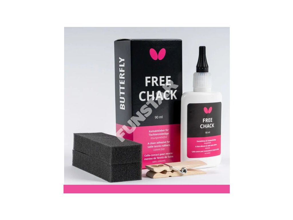 Free Chack je lepidlo na vodnej báze bez škodlivých látok (VOC free). Schválené mezinárodnou federáciou ITTF. Vhodné pro lepenie všetkých poťahov predovšetkým nových poťahov s prelepovacím efektom (napr. Dignics, Tenergy atd). Obsah: 90 ml + klip a 15 pěnových houbiček.